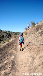 There are two ways to dismount from the cinder cone. The easier, but longer way is to go back down the same route you took up. The harder way is to surf down the front side of the cinder cone. If you choose surfing, the adult to child ratio must be 1:1. You will spend the whole 500 ft with your knees bent, providing stability over shifting rock for yourself and for your child. The price of not maintaining said stability is pretty high; lava rock isn't friendly. But, it's doable, and rather amusing ...until your quads start to burn.